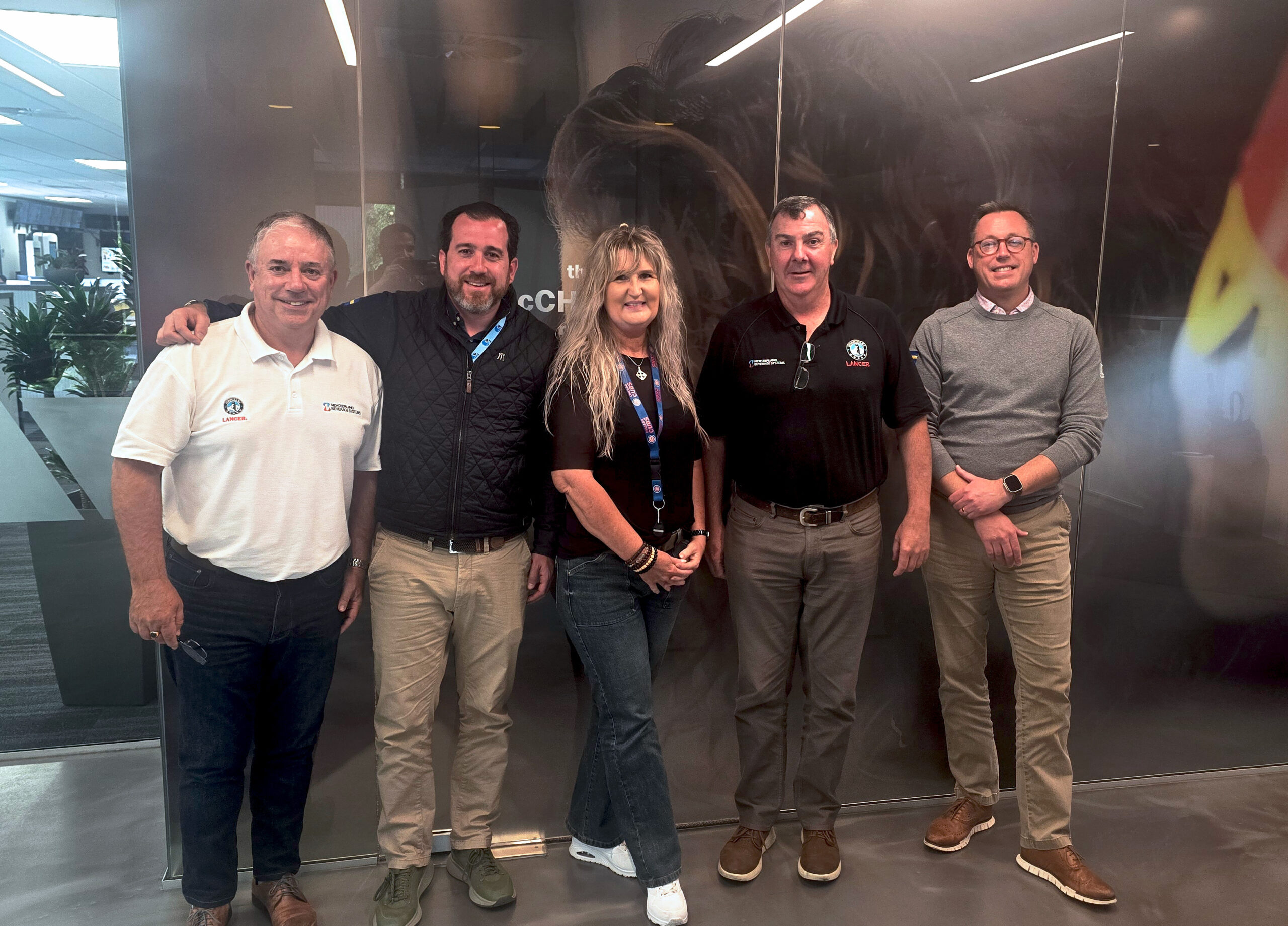 Promoting CO2 safety in New Zealand, from left: Frans Bos (NZBS), Kristoffer Eklund Cuestas (LogiCO2); Celeste Erasmus (McDonald’s); Brendan Smith (NZBS); and Ross Olsen (LogiCO2). NZBS serves as the official Lancer agent in New Zealand and the Pacific